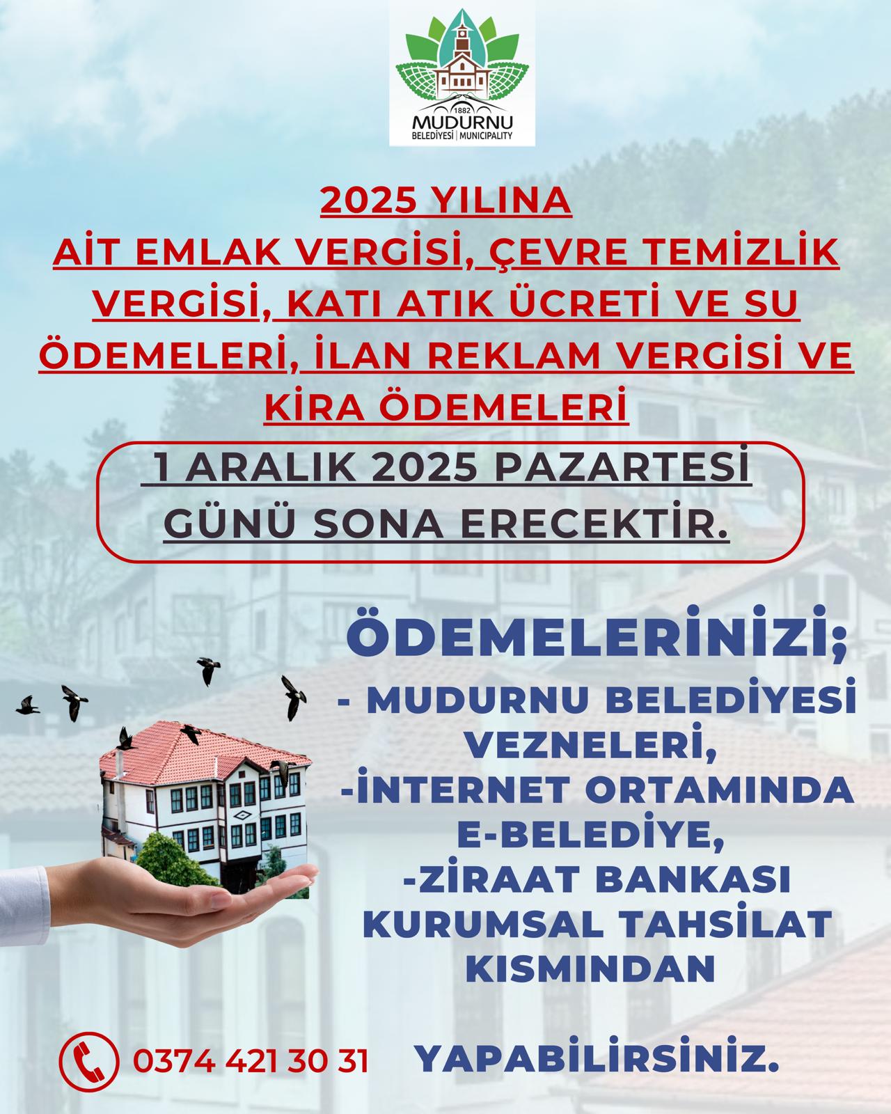 2025 YILINA AİT EMLAK VERGİSİ, ÇEVRE TEMİZLİK VERGİSİ, KATI ATIK ÜCRETİ VE SU ÖDEMELERİ, İLAN REKLAM VERGİSİ VE KİRA ÖDEMELERİ ‘1 ARALIK 2025 PAZARTESİ’ GÜNÜ SONA ERECEKTİR.